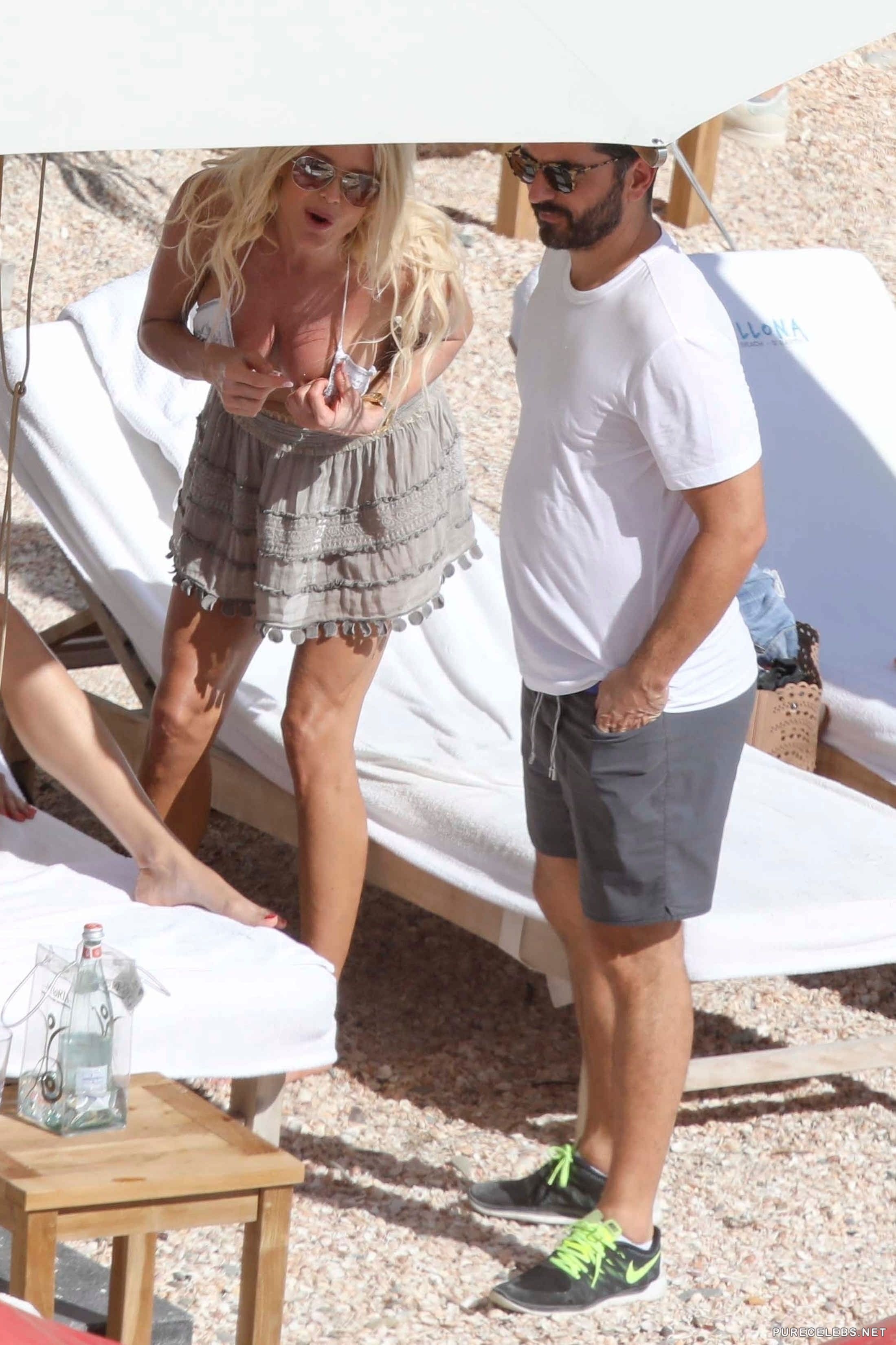If you are a fan of hot MILFs, be sure not to miss these amazing candid photos of the gorgeous Victoria Silvstedt. The mature blond babe was spotted enjoying a sunny day at the beach with her friends wearing a skimpy bikini that failed to conceal her massive tits. When Victoria bent over her firm nipples slipped out of her top to catch some rays, and luckily paparazzi didn’t miss this premium shot.
