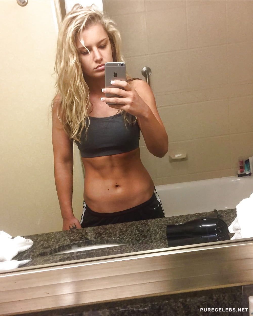 Look at this sexy blonde babe, Toni Storm and then imagine that she is a professional, Australian wrestler!! Shocked? That explains those abs and hot, firm butt she likes including in her selfies in the case that some of them get leaked and people get to see them, just like we are doing here. There is also a small tattoo this babe has on her palm, but ass looks better.
