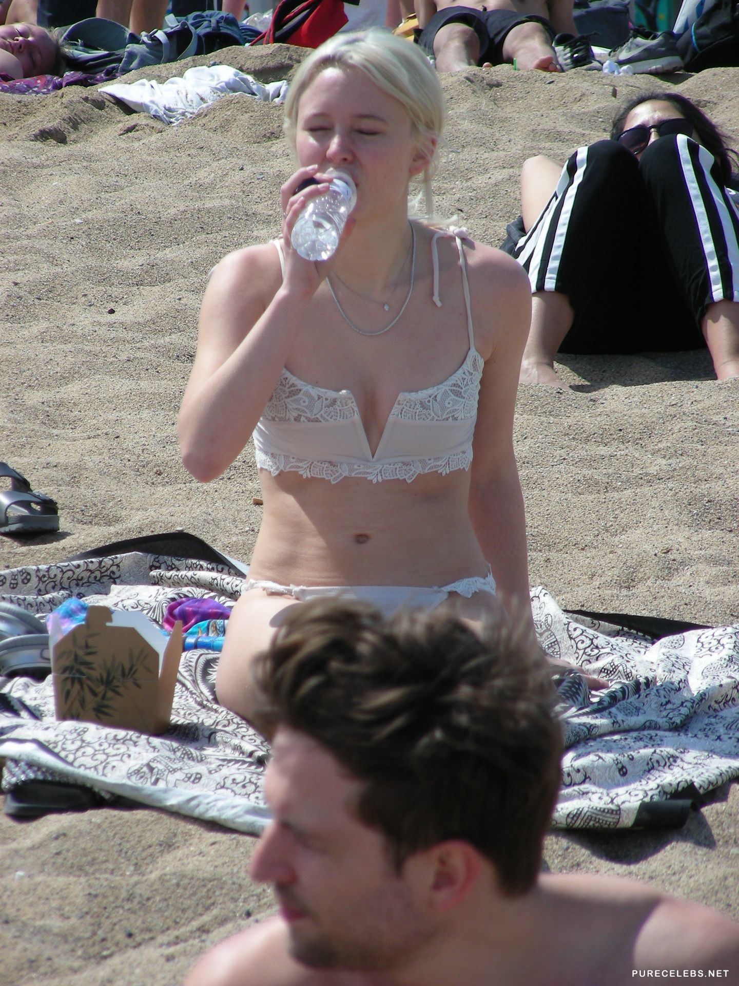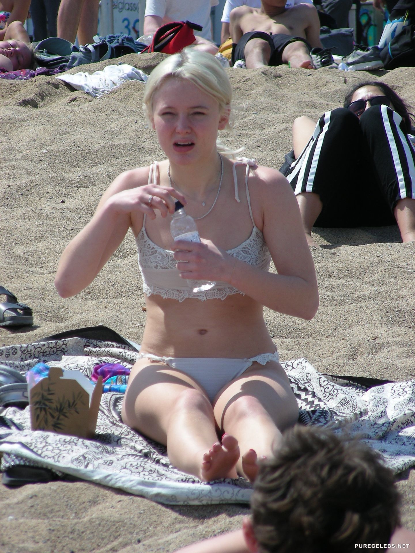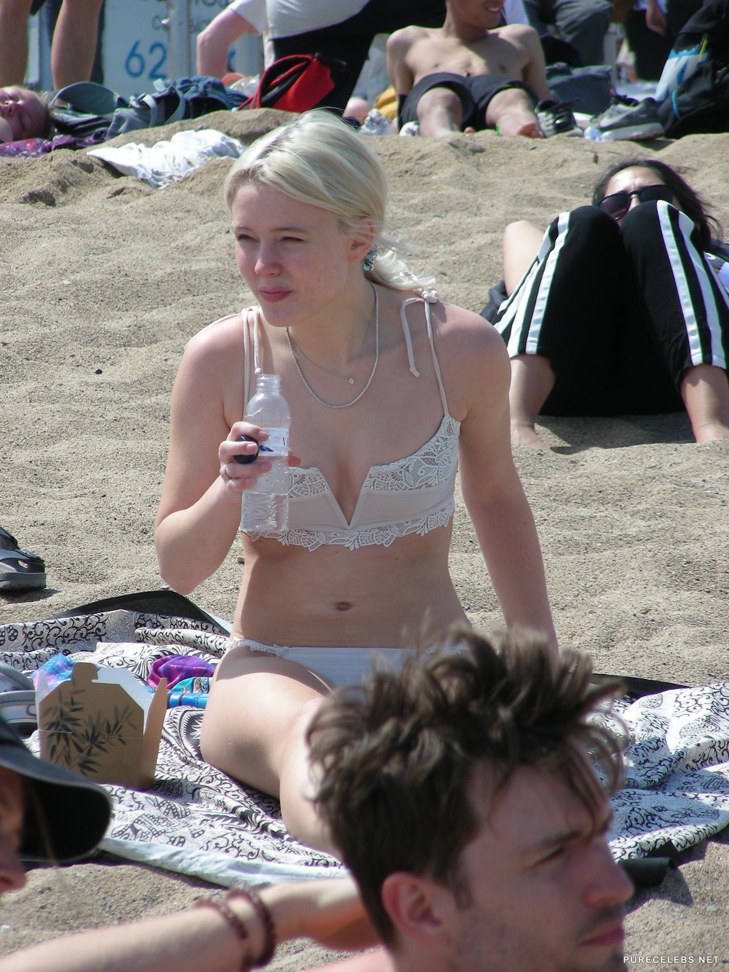 Sometimes a Swedish singer Zara Larsson likes to soak up the beach and sunbathe. She was recently caught by the paparazzi during her beach holiday. The star was wearing a beautiful white bikini which emphasized her wonderful slim body. Her boobies looked very seductive in a lace bra, and her lovely panties nicely wrapped around her sweet booty. This charming blonde is sure to make you dream of her all night long!