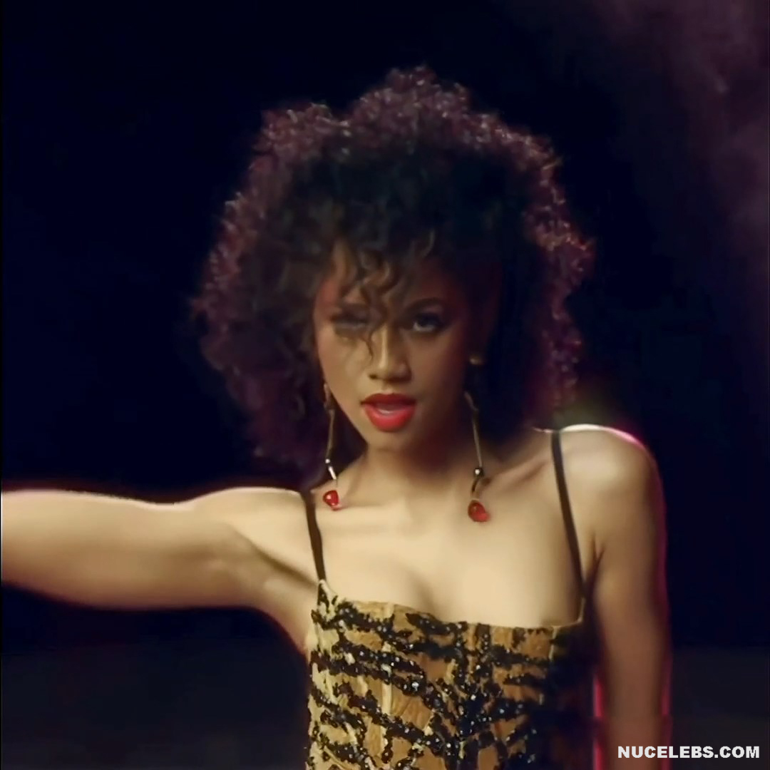 Curly-haired babe Zendaya flashes her nude boobs during a hot dance! So, this American actress looked very sexy in a gold bodycon dress adorned with black rhinestones. Also, her image was perfectly complemented by long earrings with red stones and bright makeup. The girl was without a bra this time and did not take into account the fact that the neckline of her dress is quite low. Therefore, when Zendaya raised her hand, her nude boob with a brown nipple jumped out!