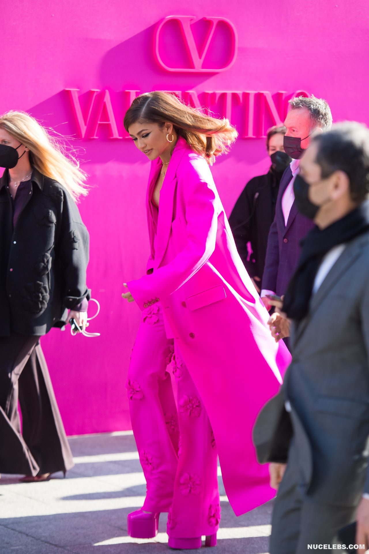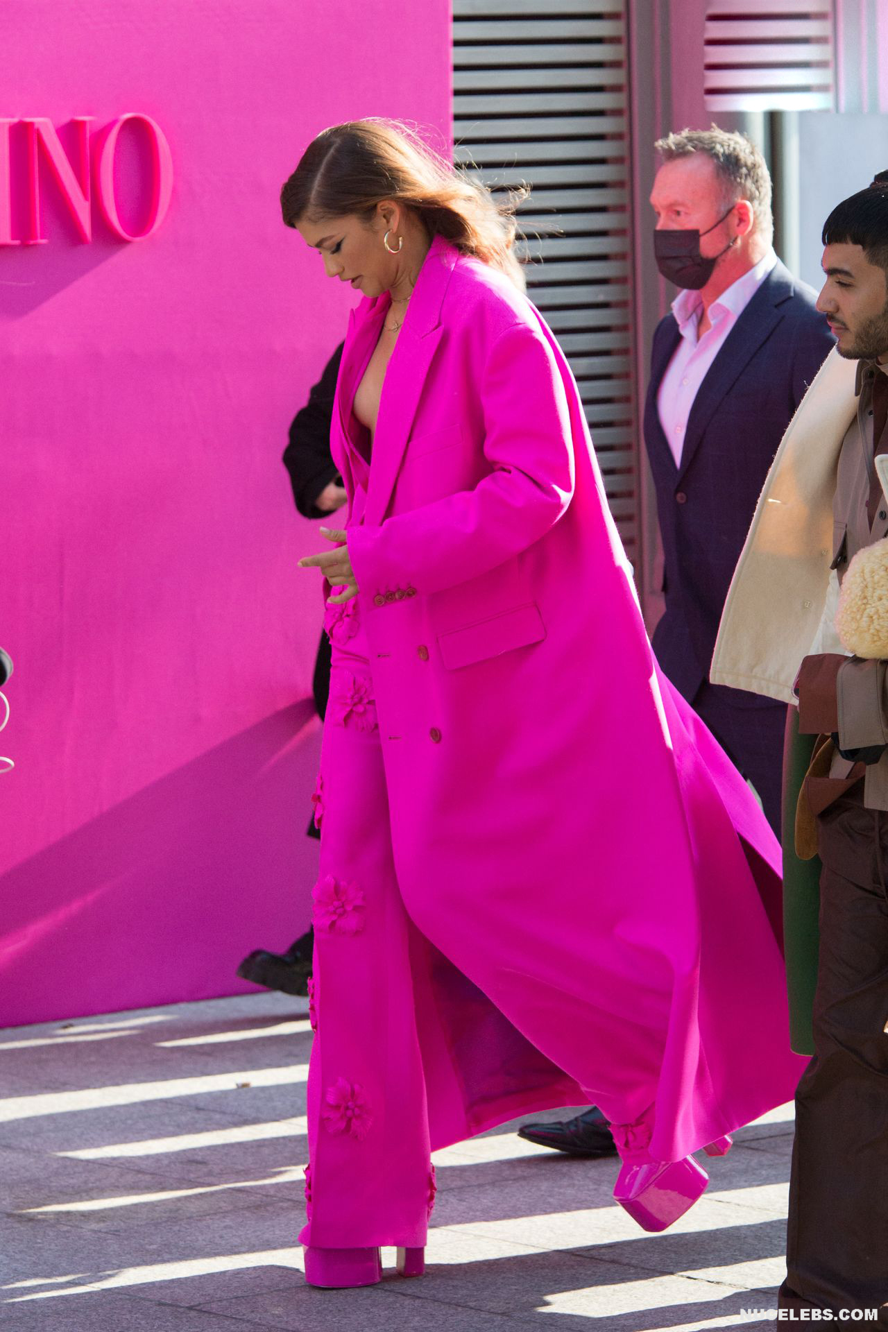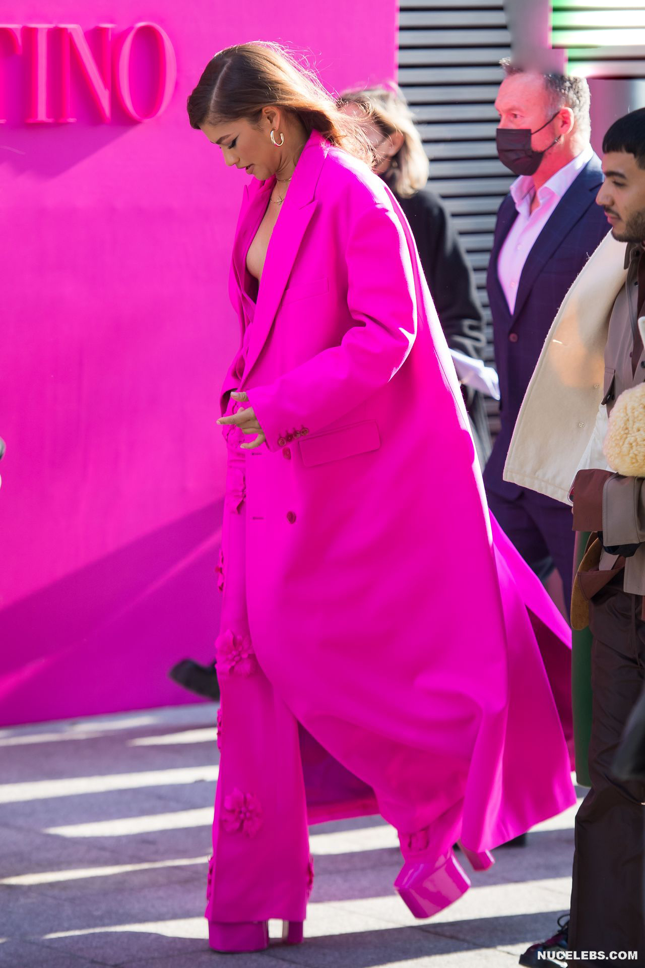 Zendaya impressed everyone with her look when she appeared at Valentino Womenswear. This time, the 25-year-old singer was dressed in a pink trouser suit embellished with floral appliqués and high-heeled platform shoes. By the way, this girl was without a bra and her jacket with a deep neckline was dressed on a naked body. So Zendaya’s nude boobs almost jumped out of it from time to time!