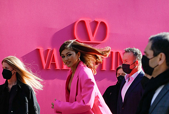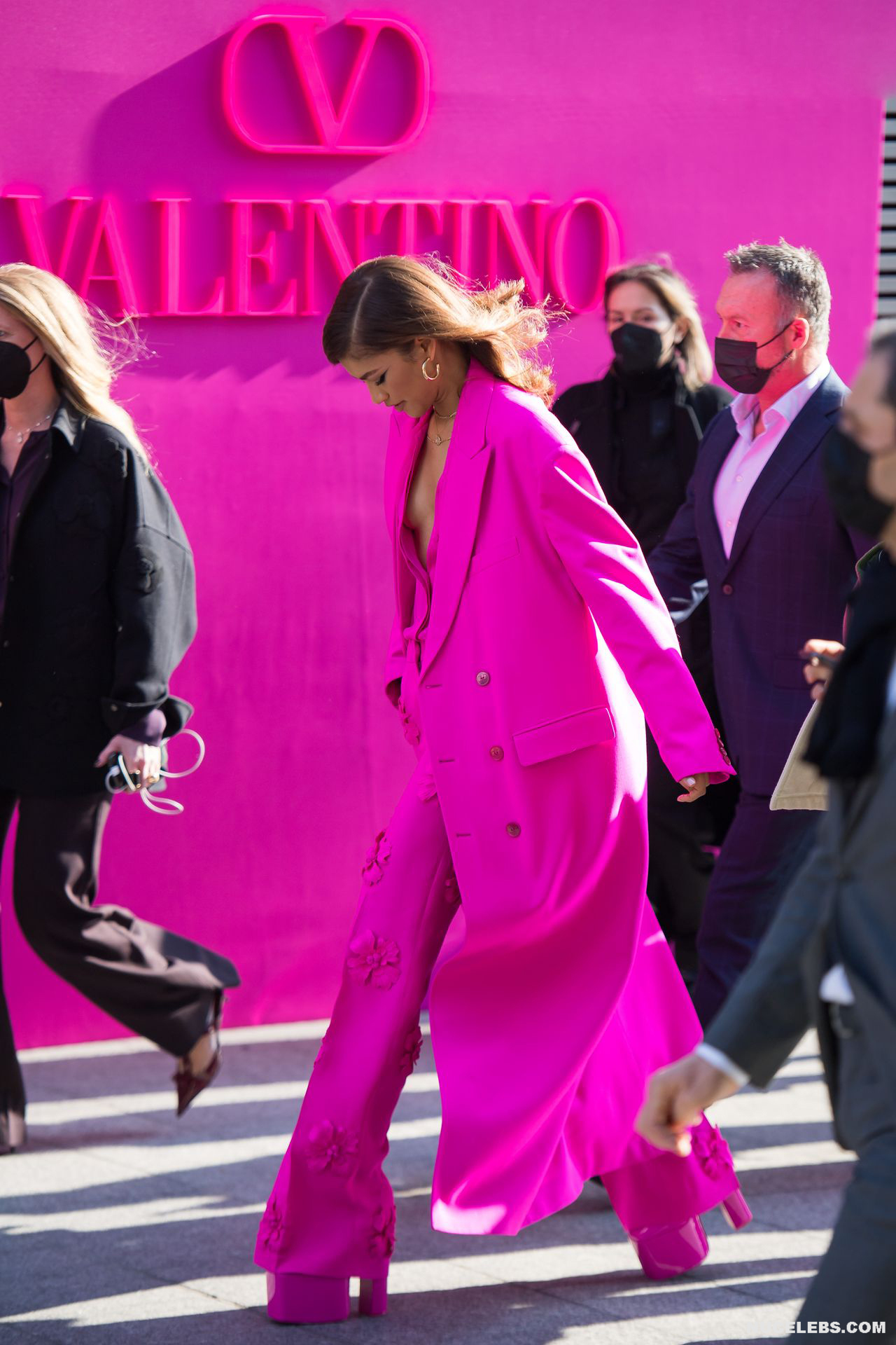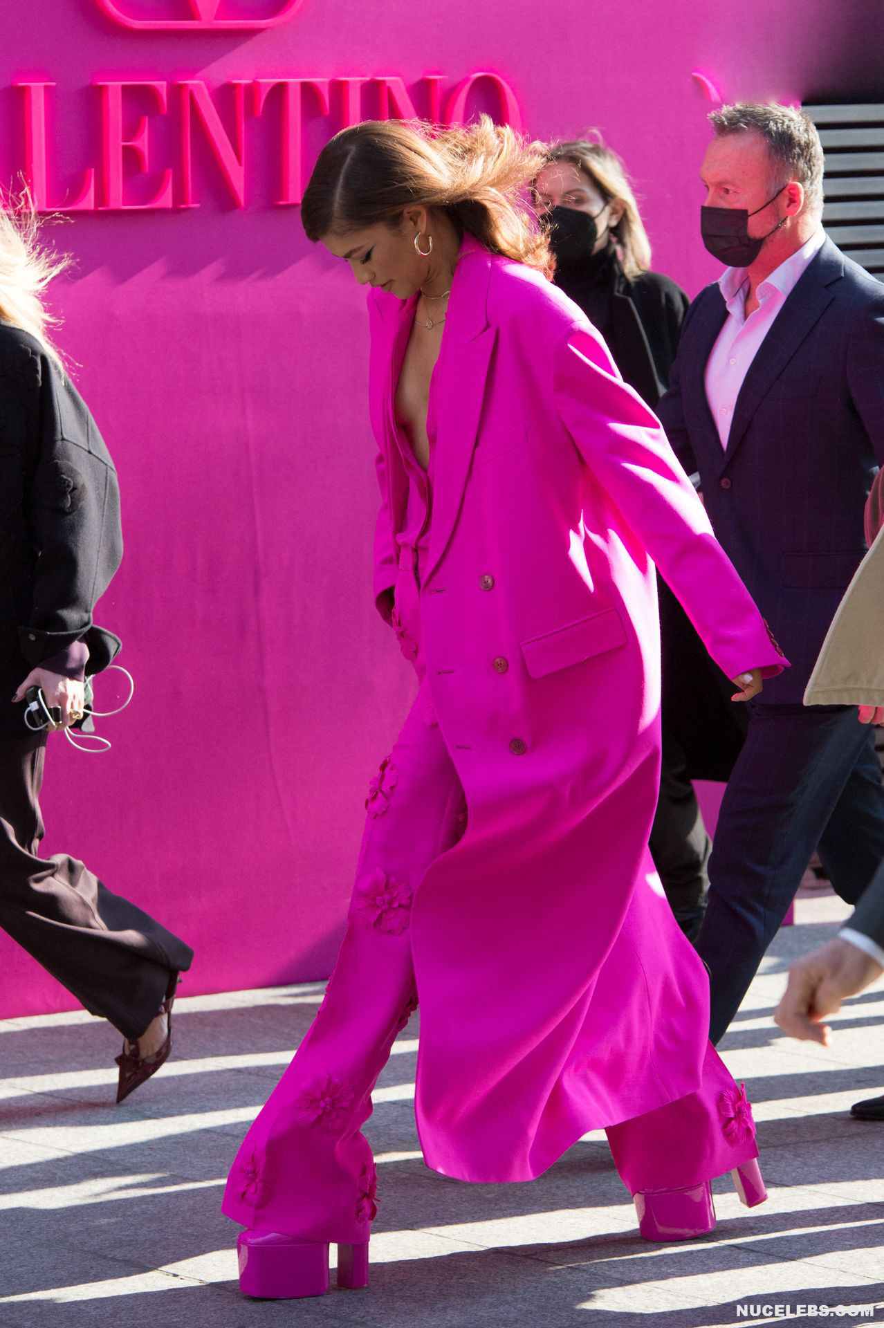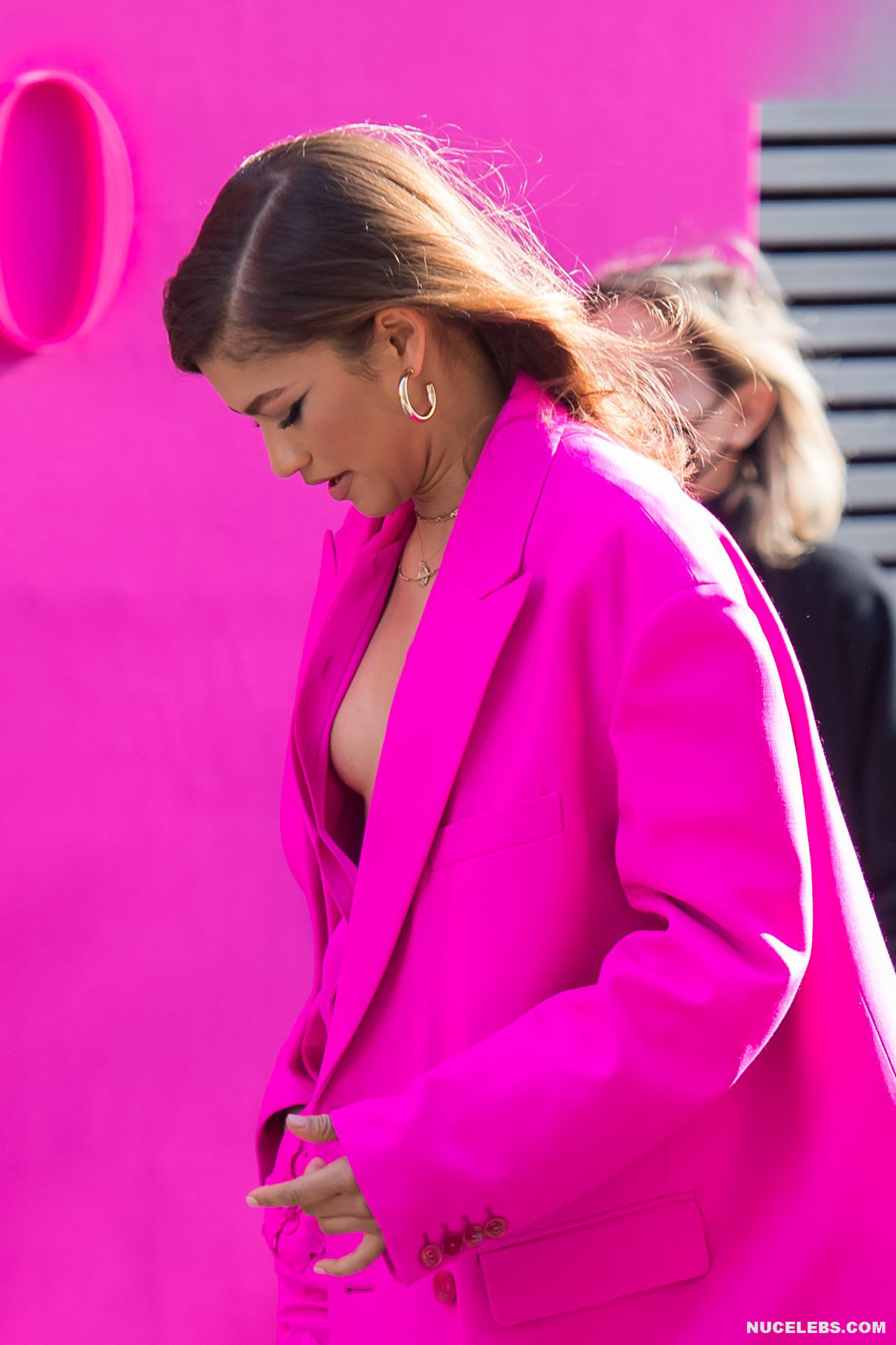 Zendaya impressed everyone with her look when she appeared at Valentino Womenswear. This time, the 25-year-old singer was dressed in a pink trouser suit embellished with floral appliqués and high-heeled platform shoes. By the way, this girl was without a bra and her jacket with a deep neckline was dressed on a naked body. So Zendaya’s nude boobs almost jumped out of it from time to time!