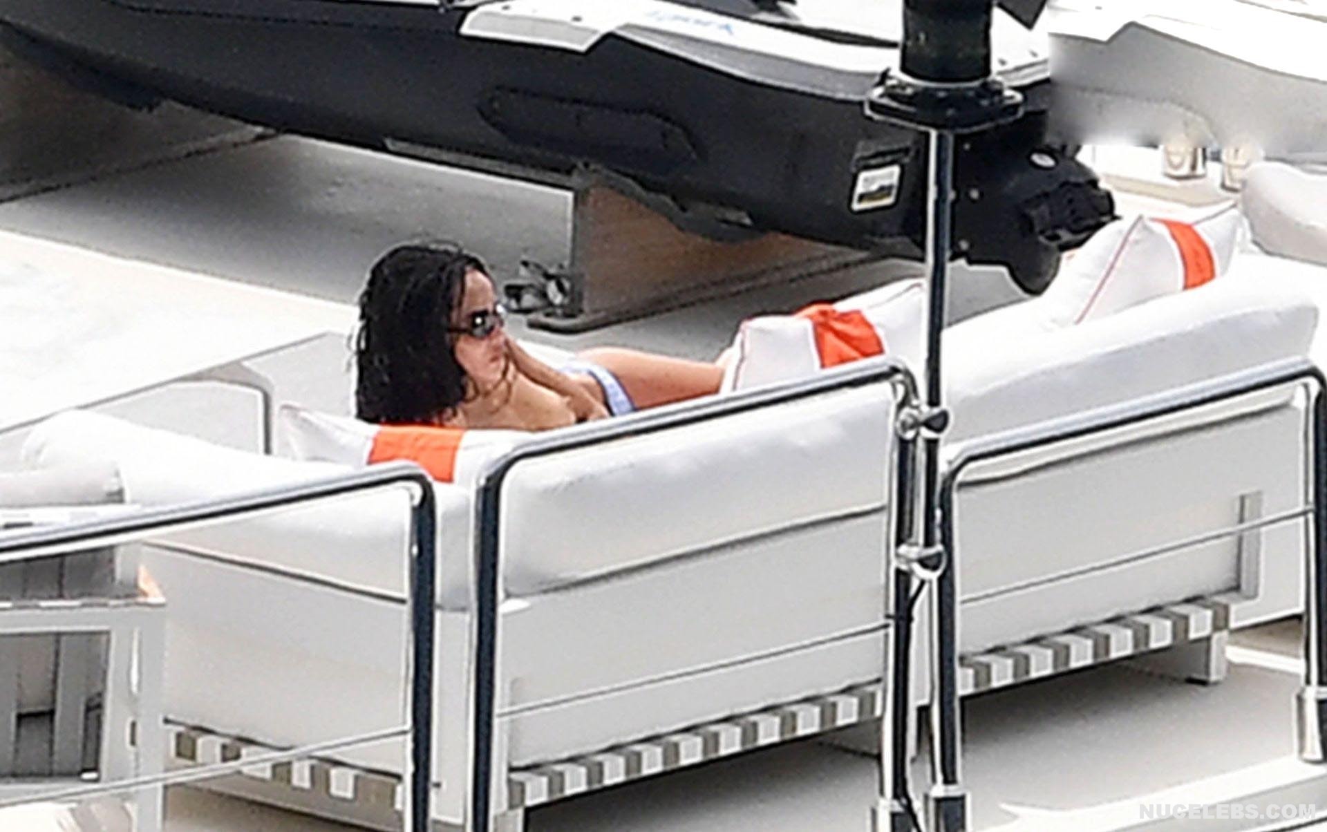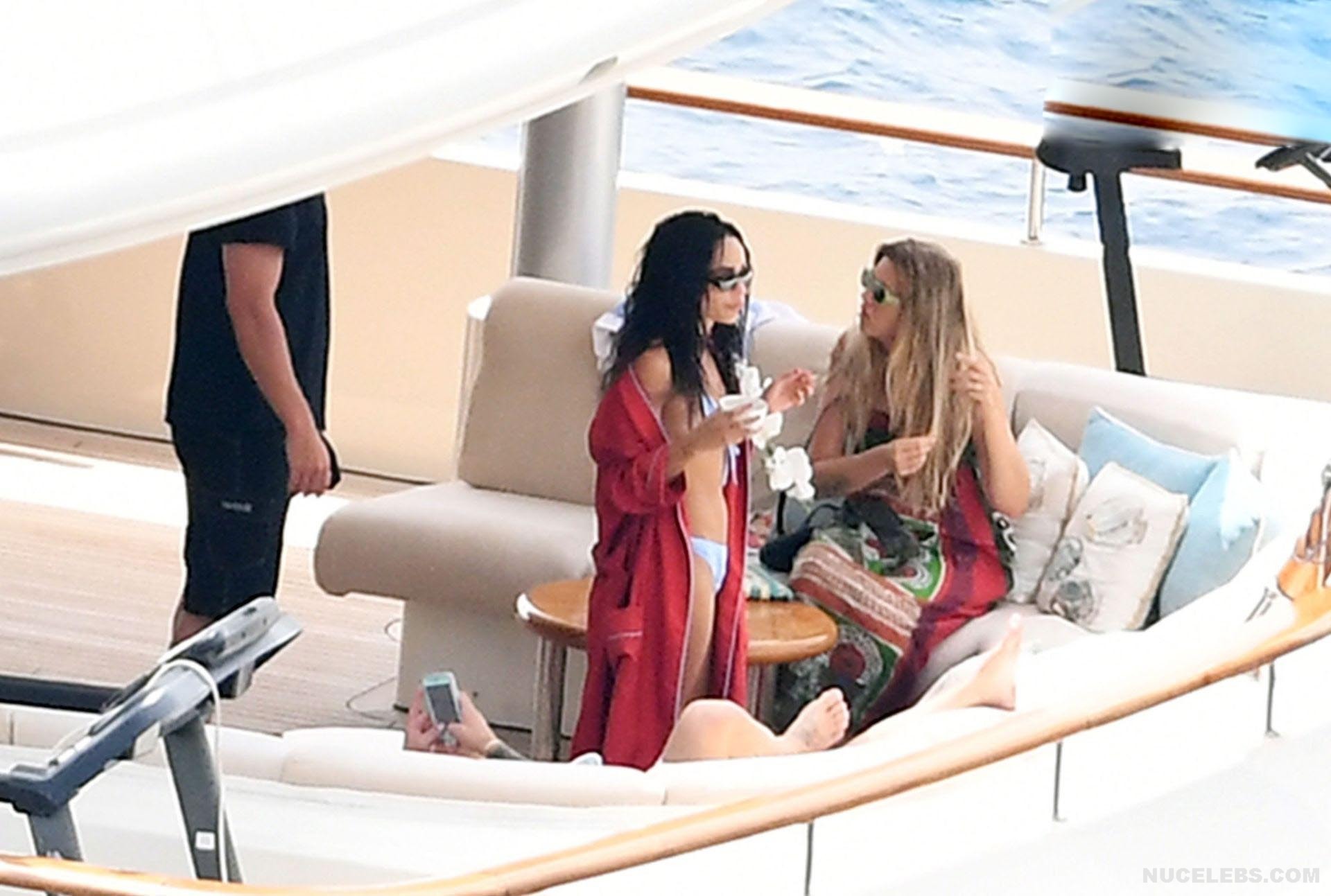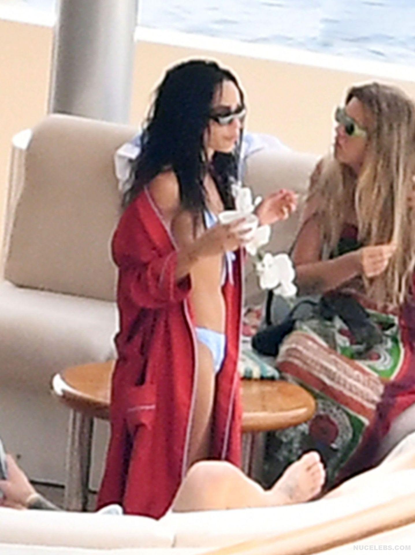 Zoe Kravitz decided to sunbathe topless on a yacht, and this made the paparazzi who followed her very happy. Well, it’s worth noting that this 33-year-old actress’ bare tits looked very juicy and seductive. You will dream about feeling her awesome boobs with hard nipples, which she showed while sunbathing on a white sofa.