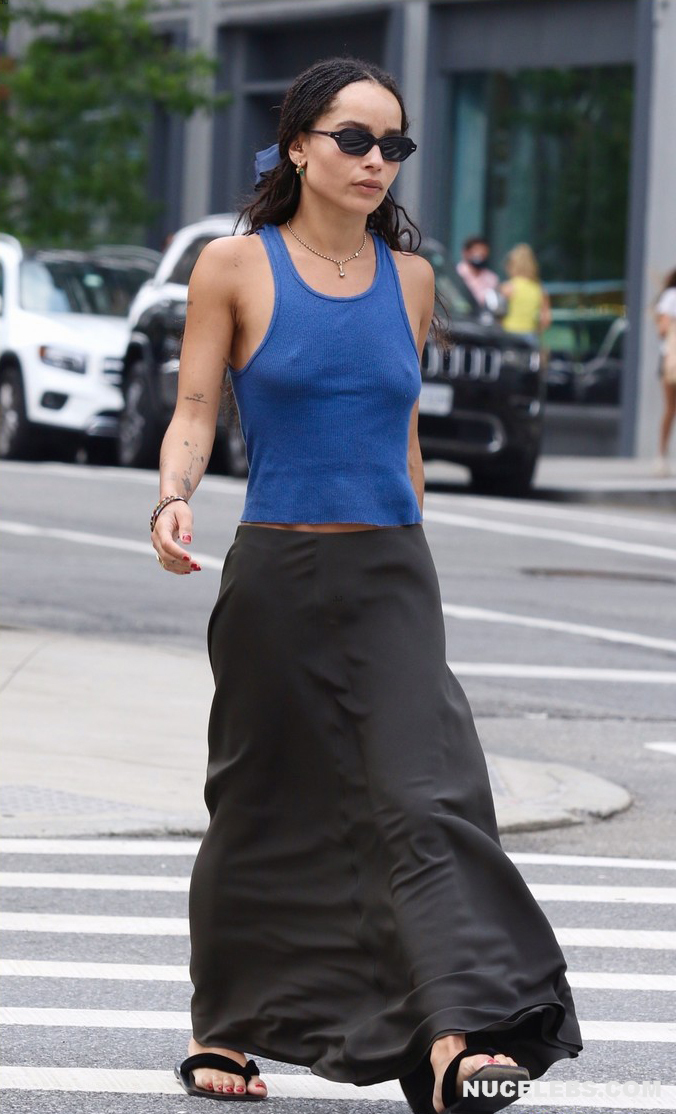 Zoe Kravitz does not like wearing a bra and this is often noticed by the paparazzi. Well, thanks to this, now we can enjoy the pictures of this American actress, in which she is caught in a blue tight top. And although Zoe Kravitz’s nude boobies are not visible through it, her poking nipples can be seen from afar. Well, maybe next time Zoe Kravitz will wear a more transparent outfit to please us with her nude breasts?