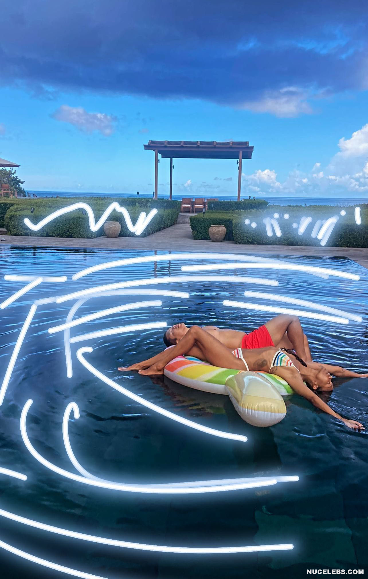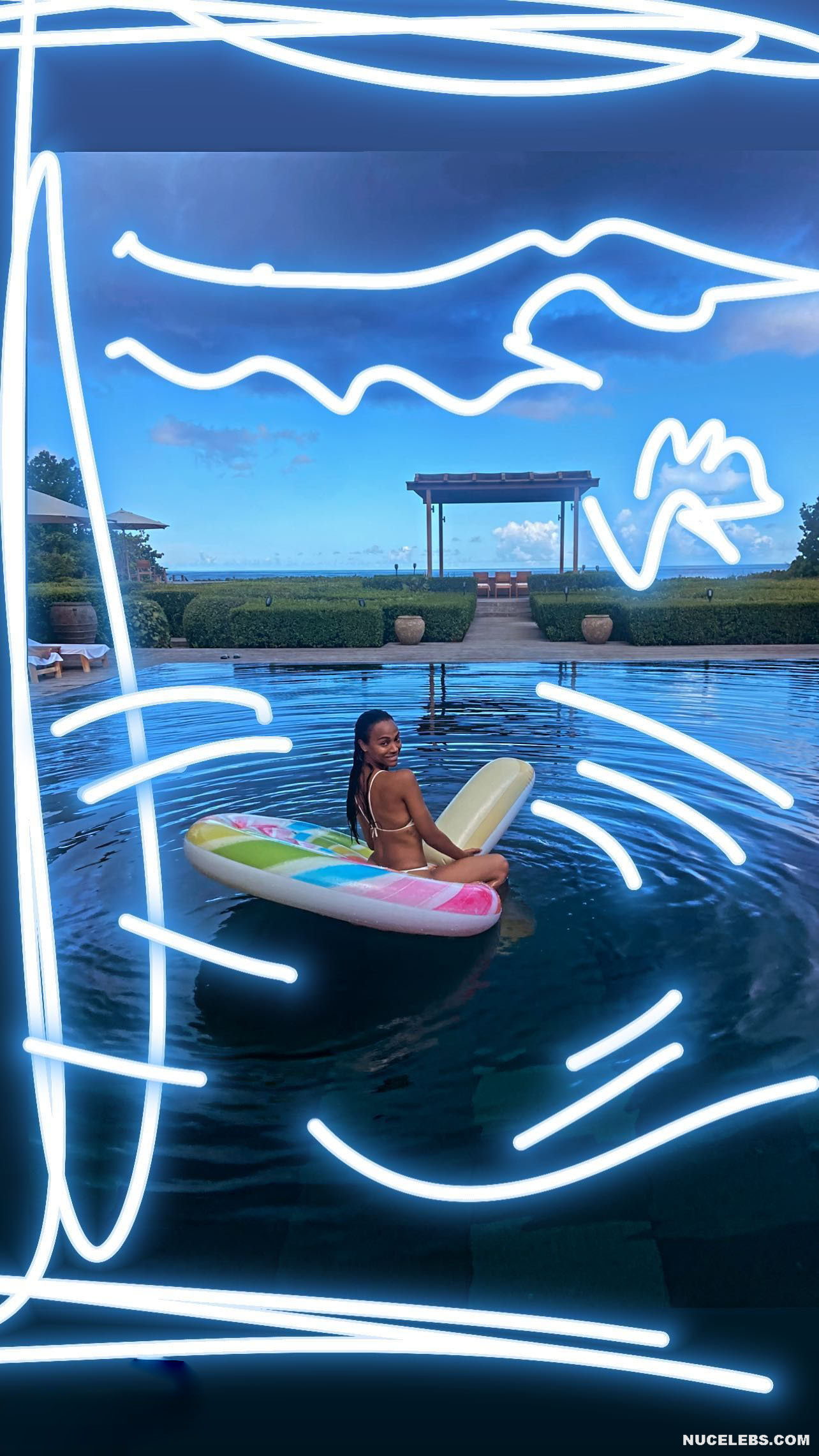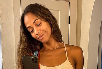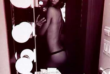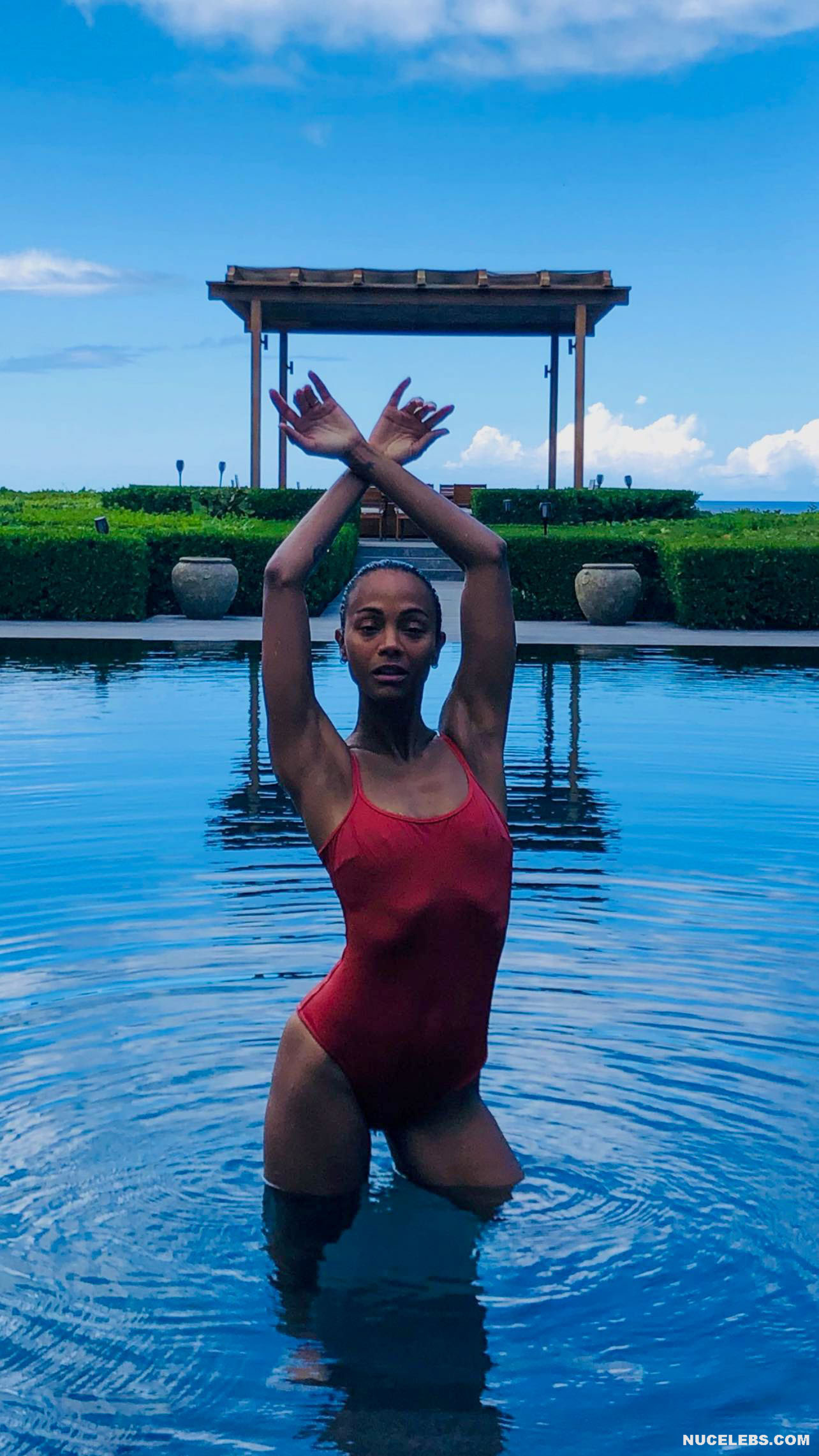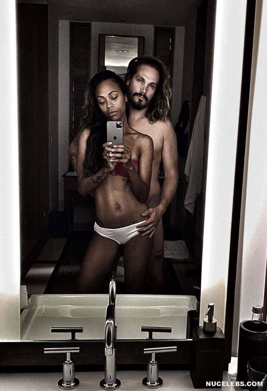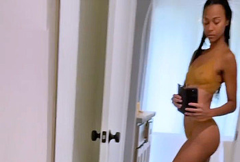 Get ready to drool looking at Zoe Saldana nude pics! This celebrity didn’t hesitate to take a naked selfie, standing in front of the mirror in the doorway. Zoe Saldana covered her nude pussy with her hand, and her long black hair slightly covered her nipples. Also, this American actress loves to be photographed in transparent outfits through which her poking nipples are visible! Oh, this beauty looked incredibly sexy when she posed in a red swimsuit near the pool.