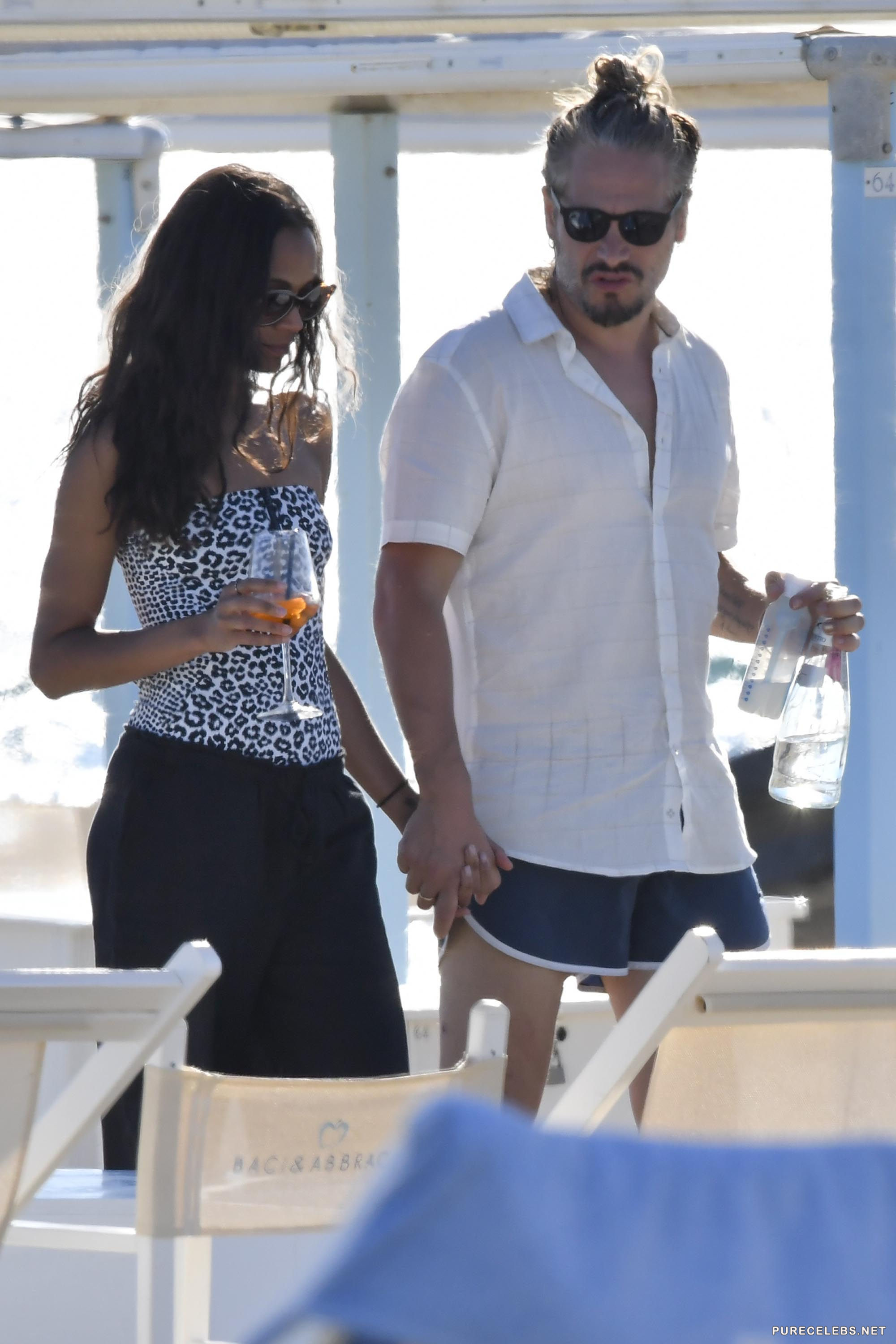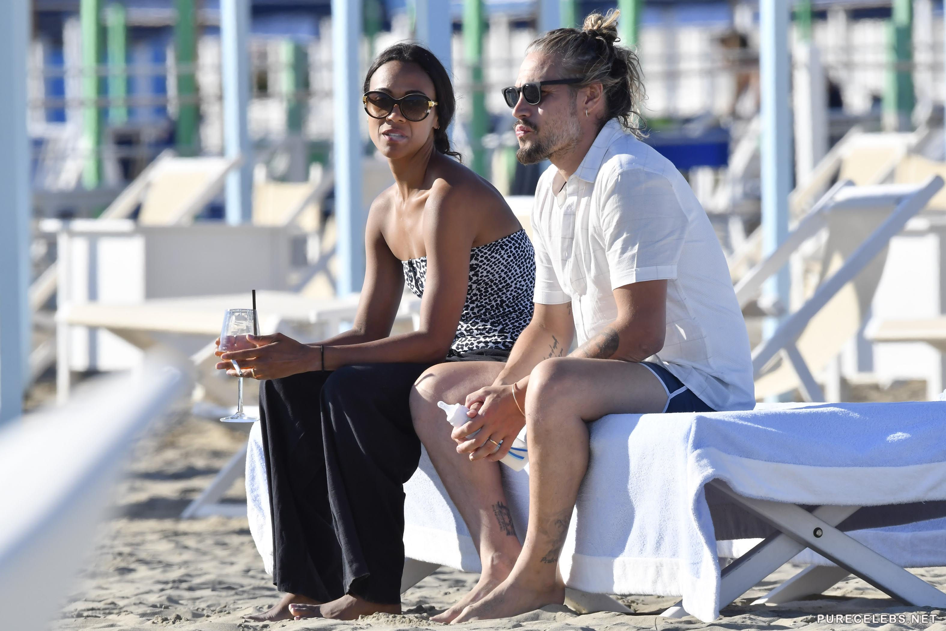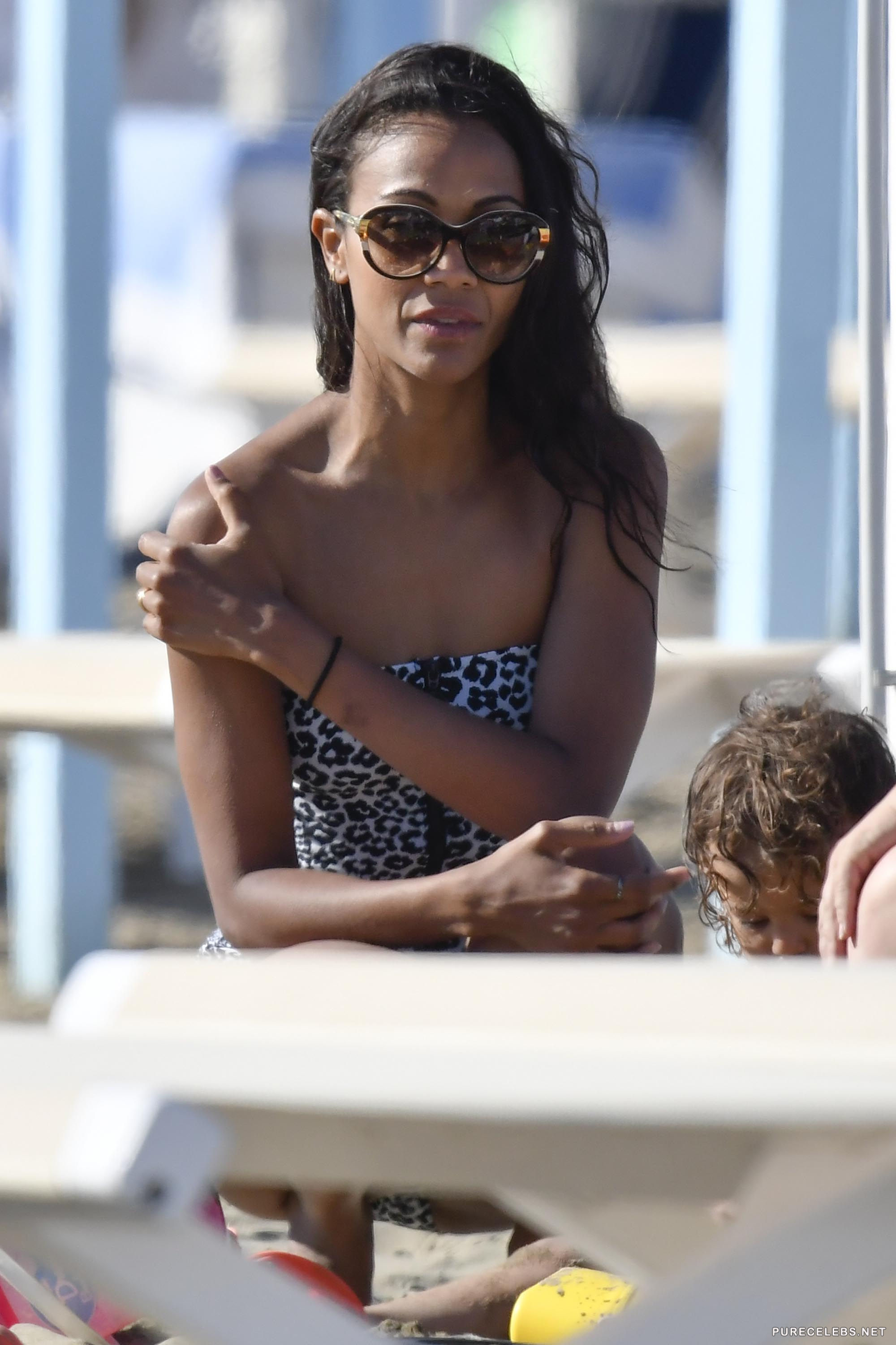 Perfectly slim, of extraordinary beauty and looking better than ever, even though she is in her forties, Zoe Saldana, American actress, graceful dancer, mother of three is wearing an animal printed swimsuit and relaxing on the beach, with her husband. Most probably they have left kids with their nanny and had a day off from working and parenting, to enjoy with each other and charge their batteries for upcoming projects.